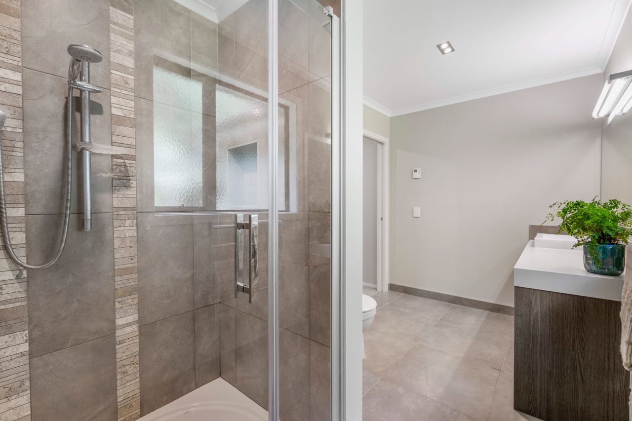 Accommodation is generous with four bedrooms, including a master suite with walk-in wardrobe and ensuite. Downstairs, a guest bedroom and bathroom provide excellent flexibility for extended family, teenagers, visitors, or working from home.