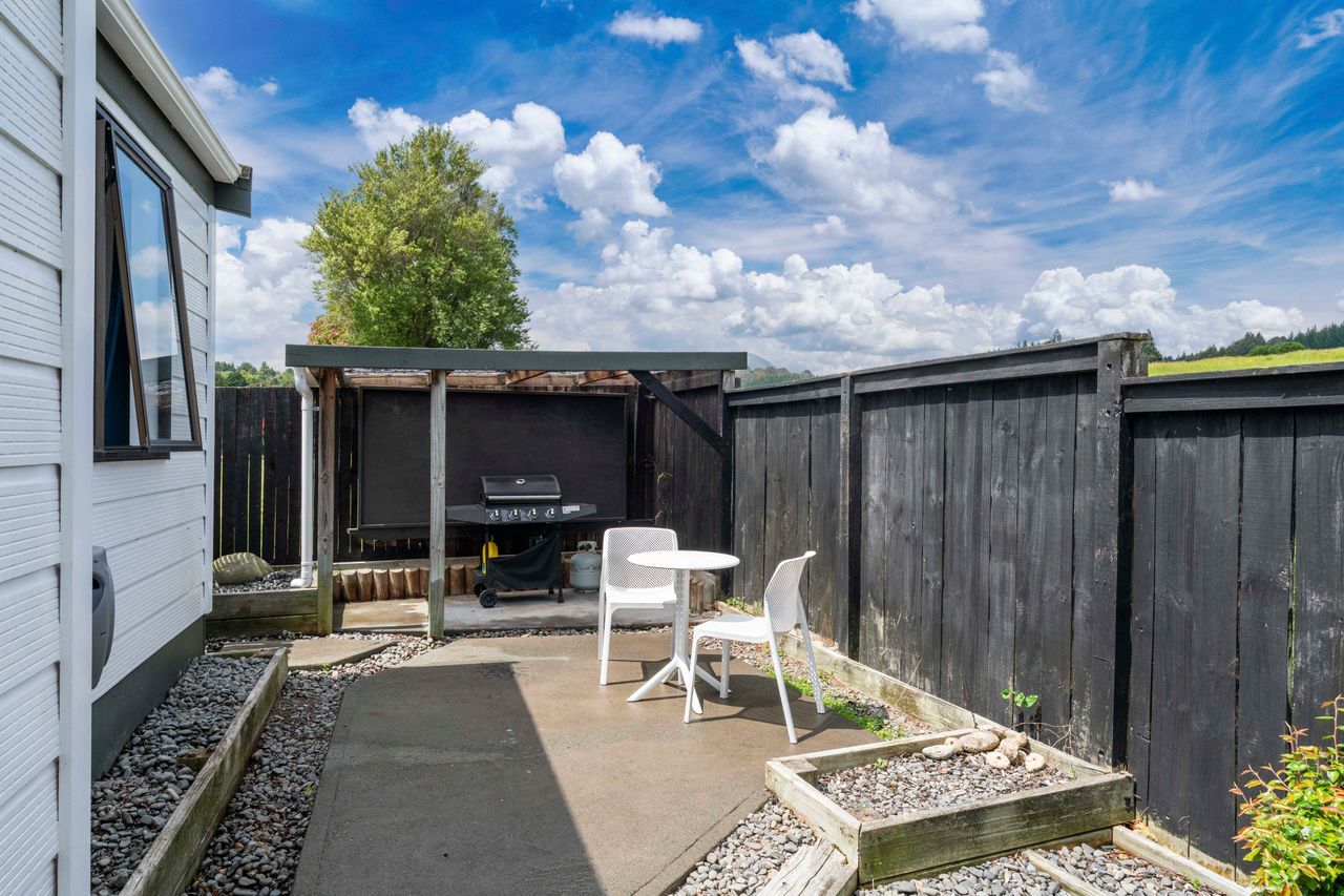 Inside, the freshly painted interior, new heat pumps, updated lighting, and new flooring create a bright, welcoming feel. High exposed beam ceilings add space and light, while the fireplace on a wetback keeps the home warm and inviting in the cooler months. The functional kitchen flows easily to sunny outdoor areas; a compact front deck and private rear patio with gate through to neighbouring pasture.