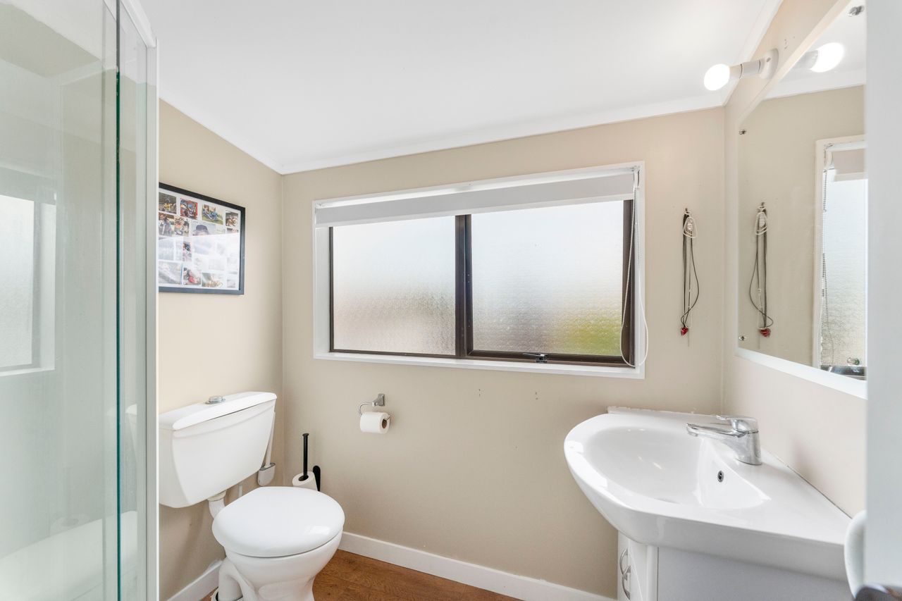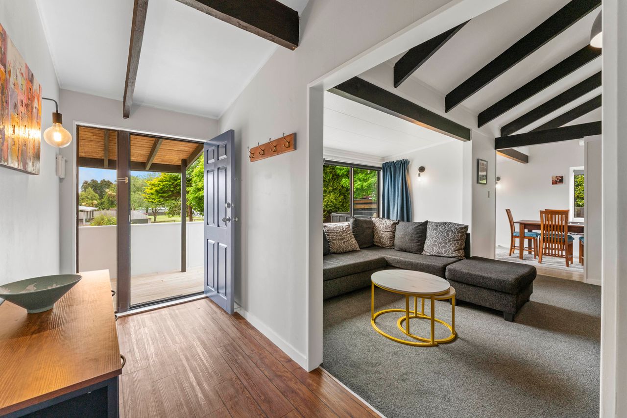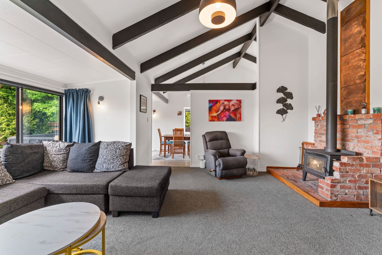 Inside, the freshly painted interior, new heat pumps, updated lighting, and new flooring create a bright, welcoming feel. High exposed beam ceilings add space and light, while the fireplace on a wetback keeps the home warm and inviting in the cooler months. The functional kitchen flows easily to sunny outdoor areas; a compact front deck and private rear patio with gate through to neighbouring pasture.
