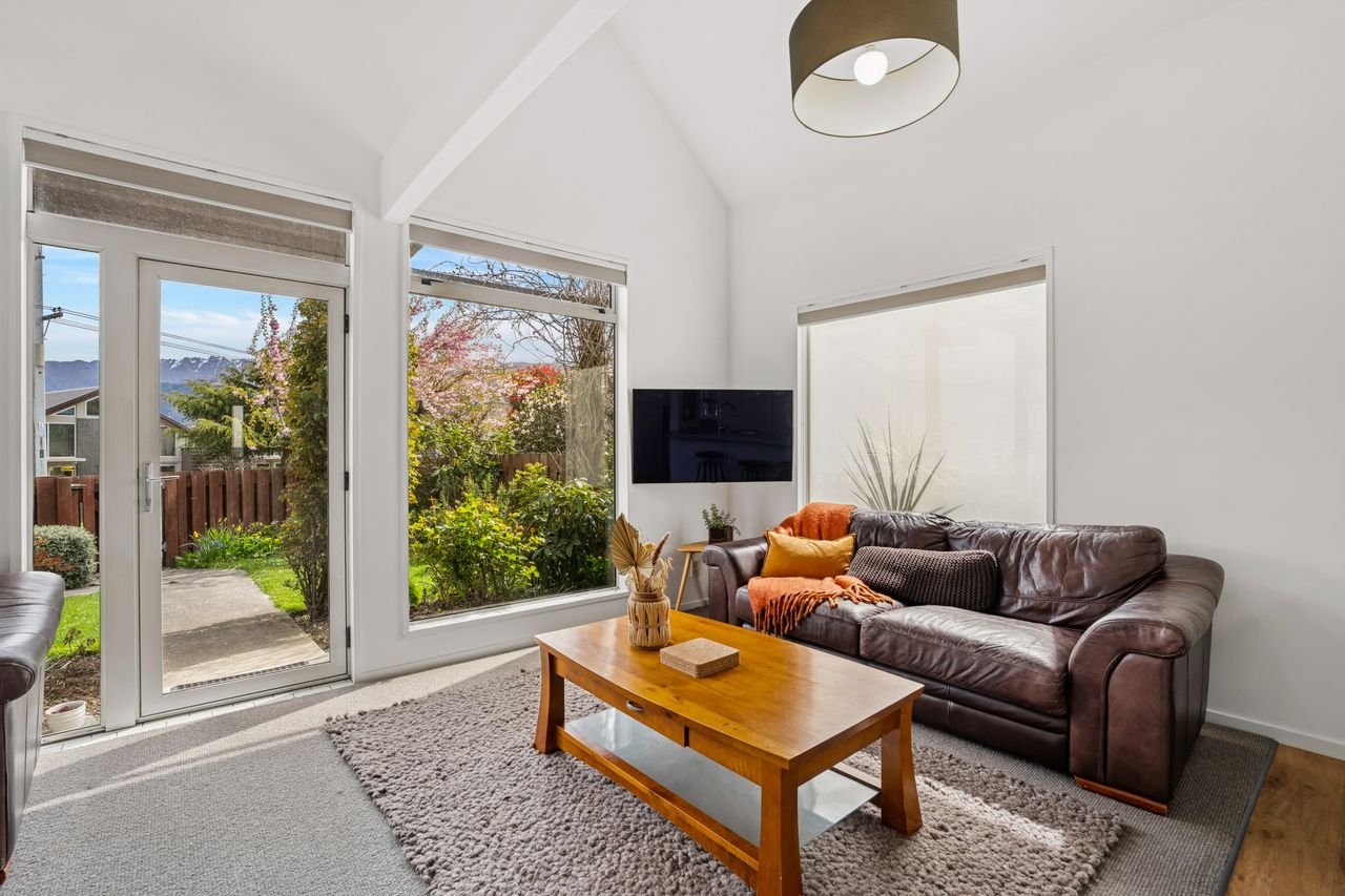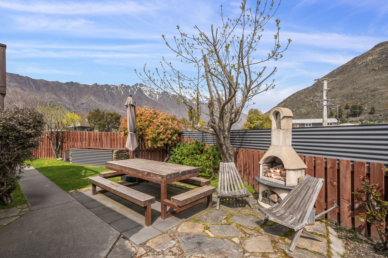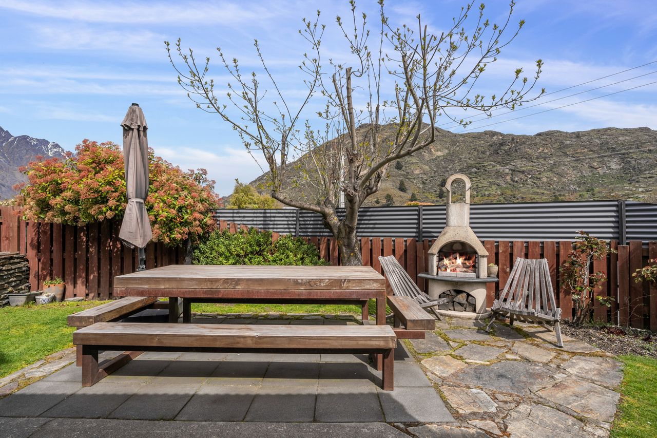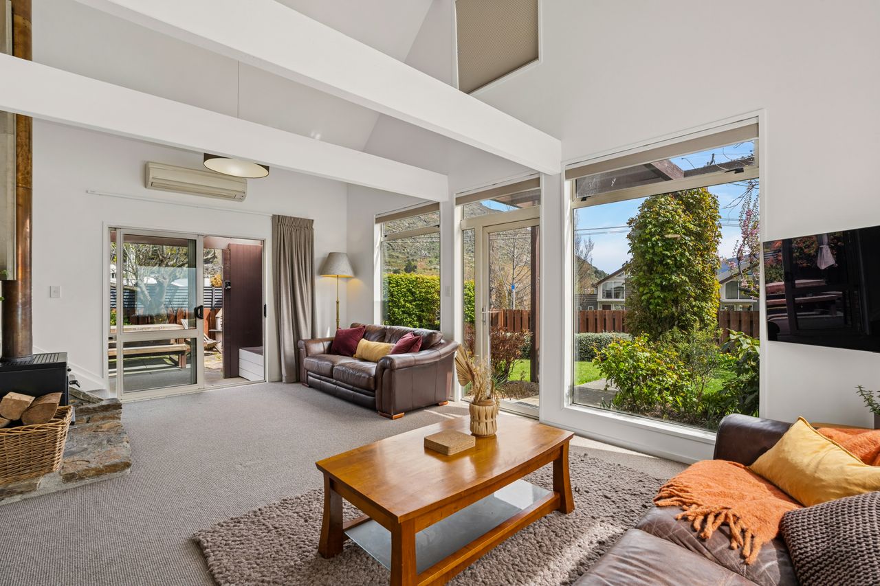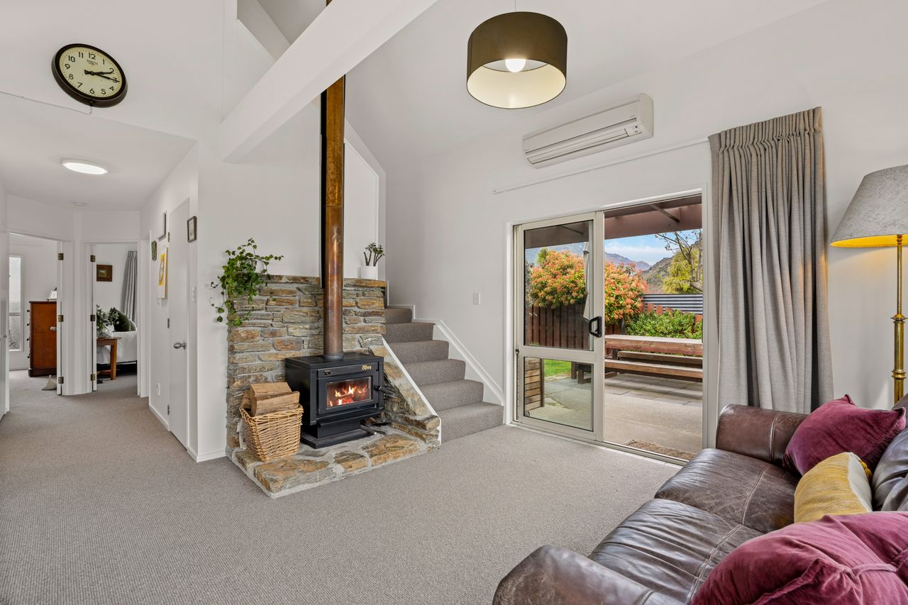 The open-plan living area is a highlight, featuring high beamed ceilings that create a sense of space and charm. A cosy wood fire and heat pump provide year-round comfort, while large double-glazed windows capture sunshine and frame established gardens with Remarkables mountain views.