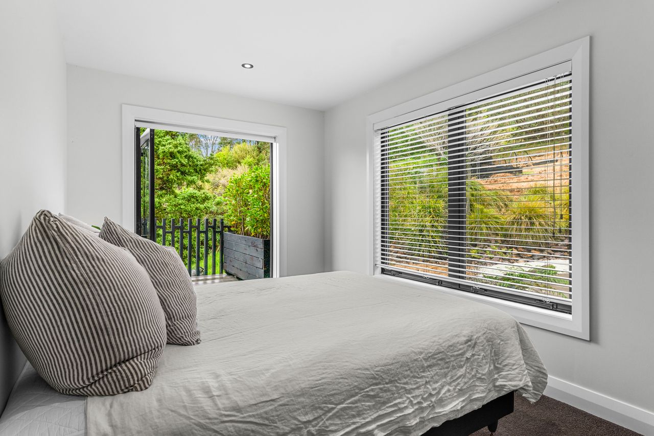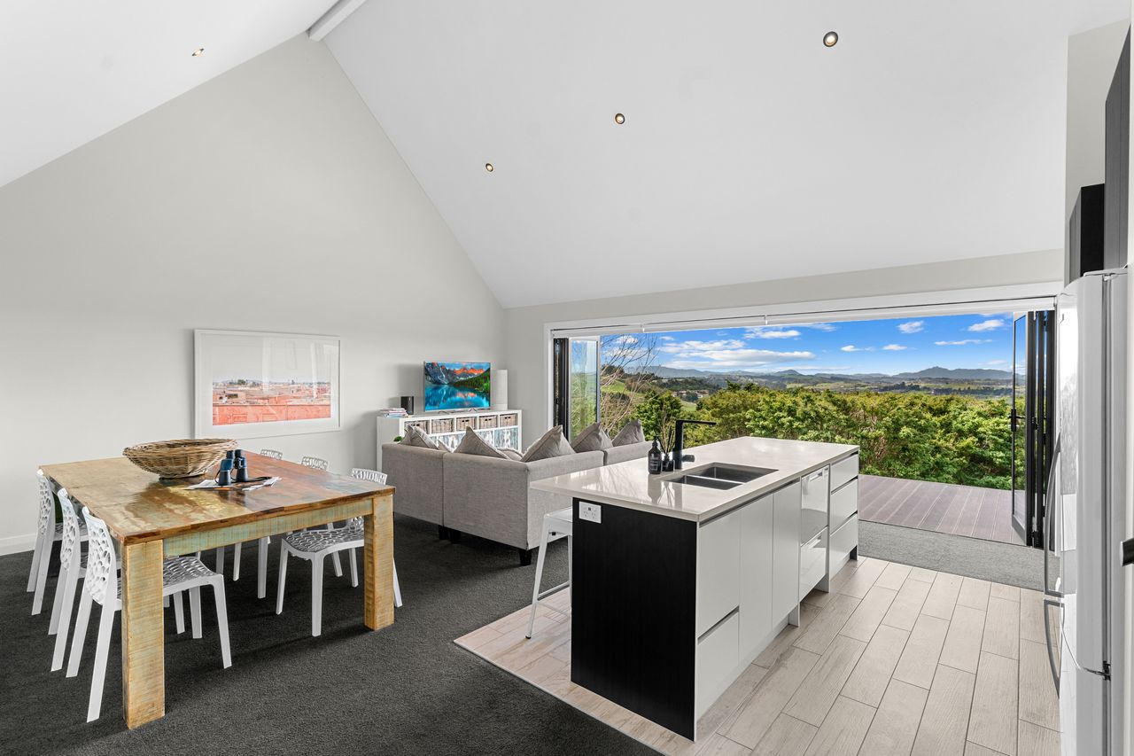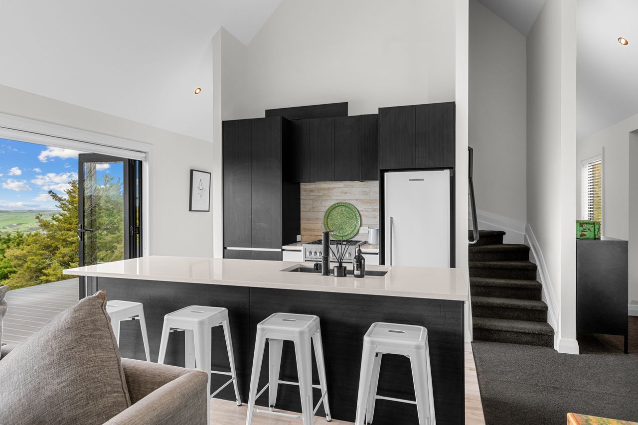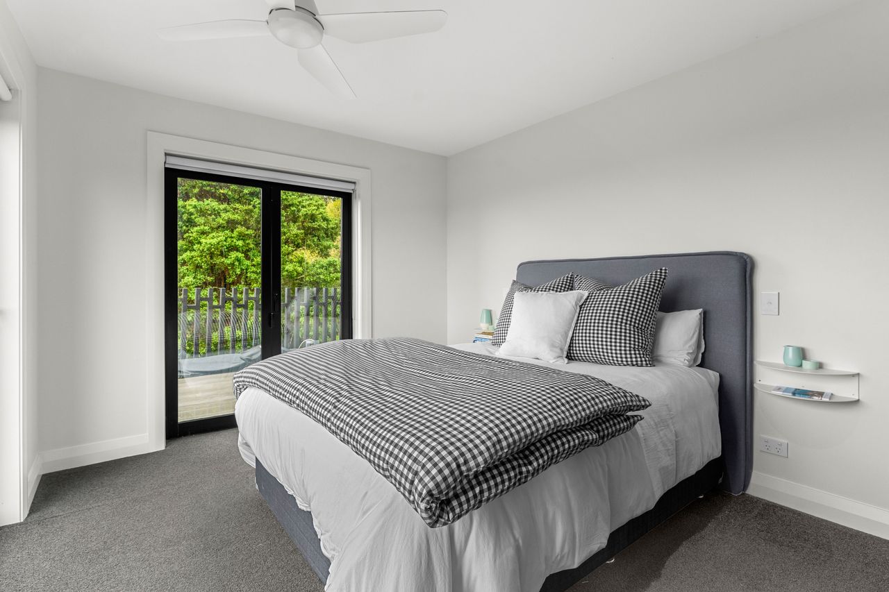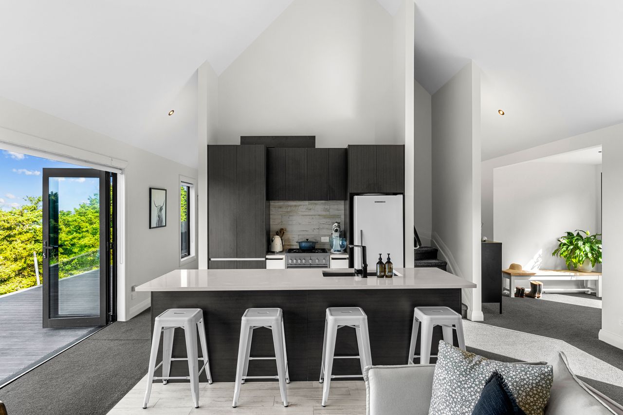 Recently refreshed inside and out, the home presents beautifully: new interior paint, a freshly stained exterior and decking, a new concrete driveway, and upgraded landscaping set the tone. The entry level centers on an airy, open-plan living area with a cathedral ceiling and expansive double-glazed sliders that frame the rural and water outlook. The sleek kitchen features an engineered-stone benchtop and an oversized storage cupboard for effortless everyday living. Two bedrooms on this level are thoughtfully separated by an acoustically insulated wall for privacy, served by a bathroom and a discreet pocket laundry.
