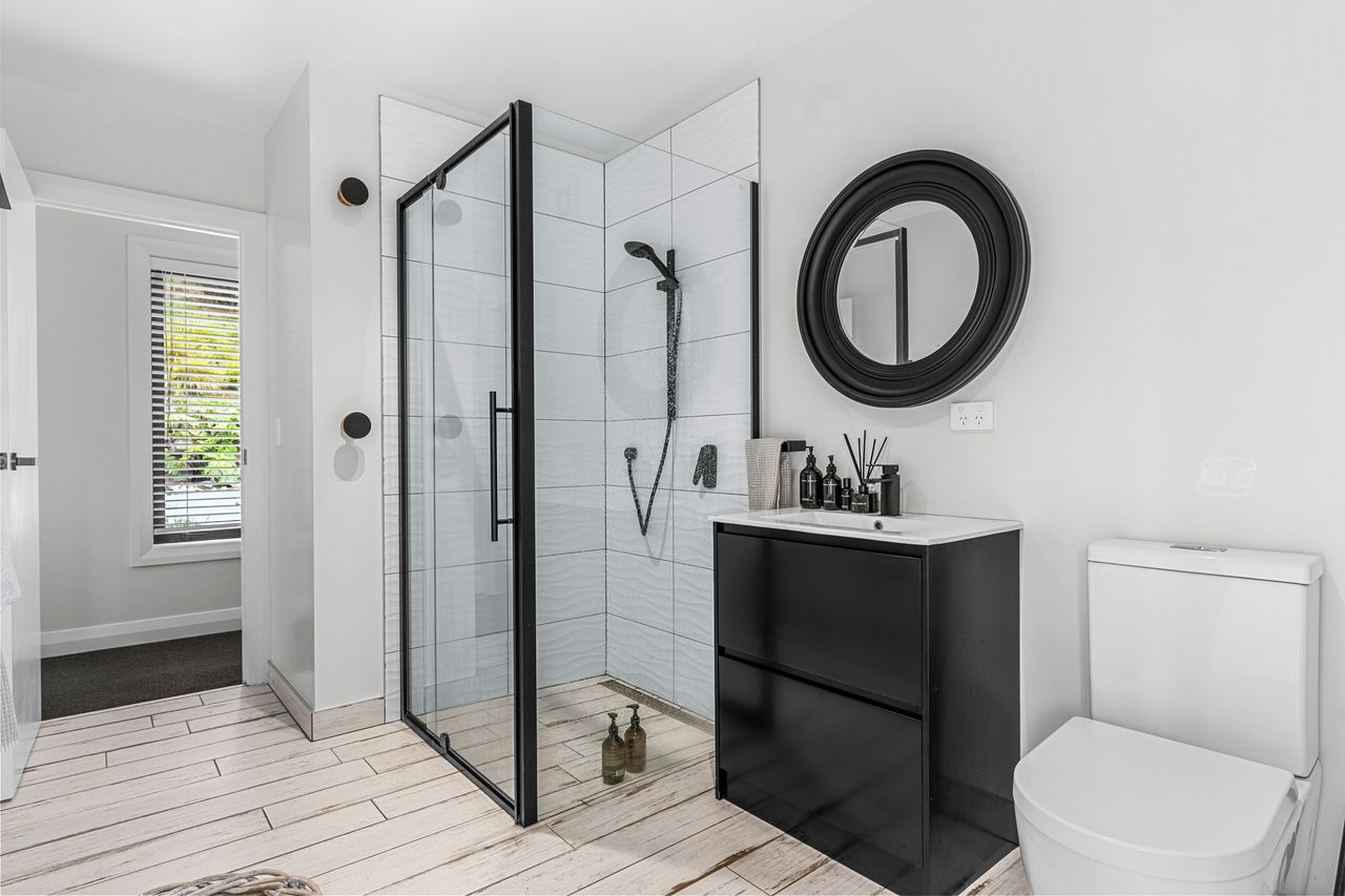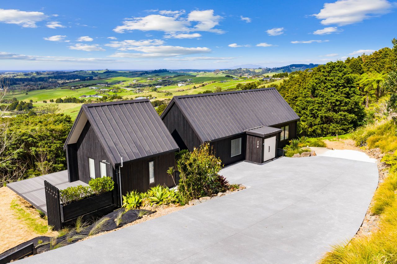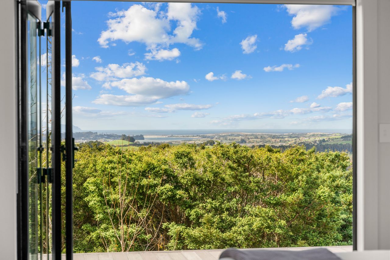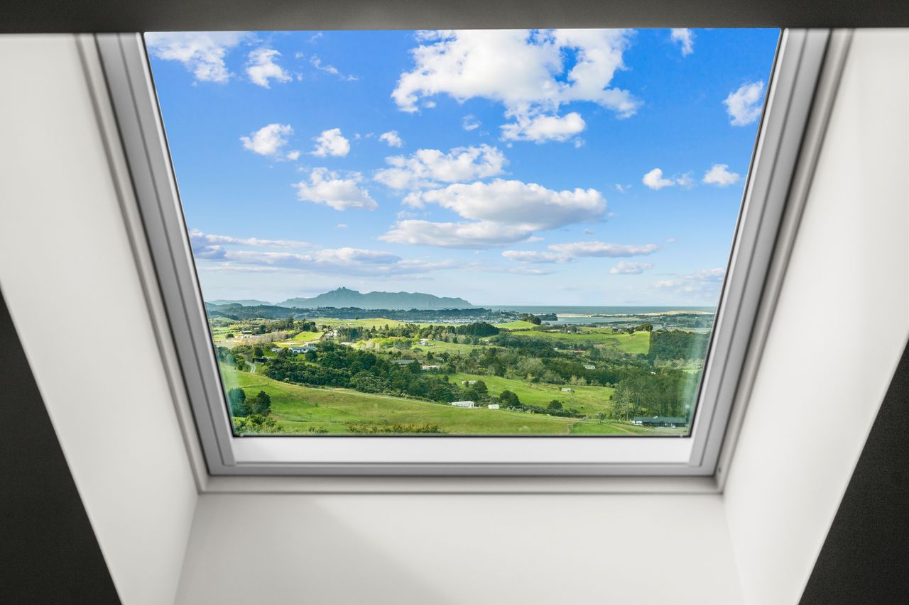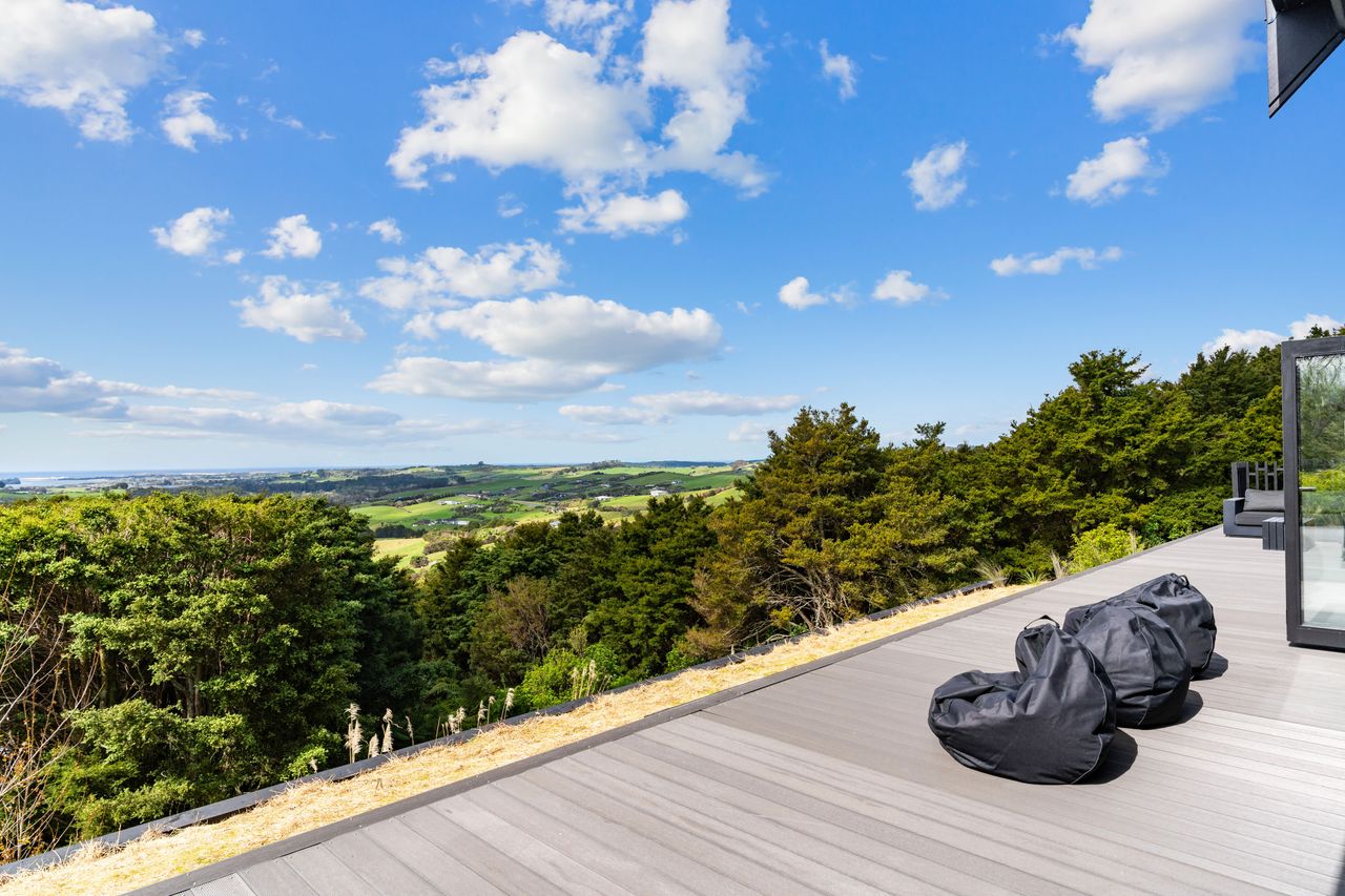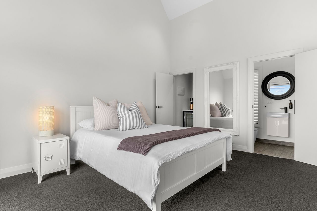 Recently refreshed inside and out, the home presents beautifully: new interior paint, a freshly stained exterior and decking, a new concrete driveway, and upgraded landscaping set the tone. The entry level centers on an airy, open-plan living area with a cathedral ceiling and expansive double-glazed sliders that frame the rural and water outlook. The sleek kitchen features an engineered-stone benchtop and an oversized storage cupboard for effortless everyday living. Two bedrooms on this level are thoughtfully separated by an acoustically insulated wall for privacy, served by a bathroom and a discreet pocket laundry.