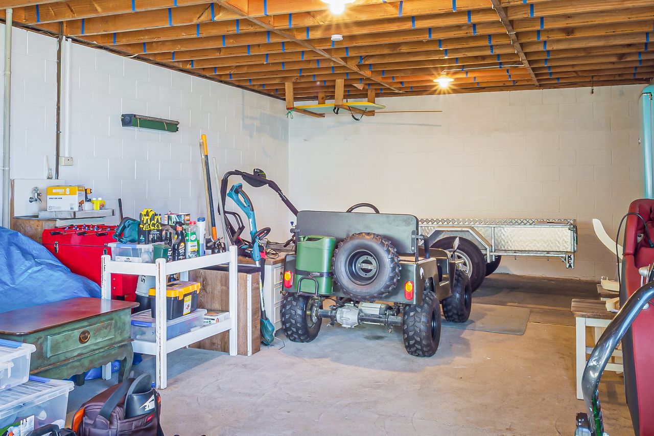 The garage holds more than just storage; included in the sale are a small jeep and go-kart, adding a playful touch to an already unique offering.