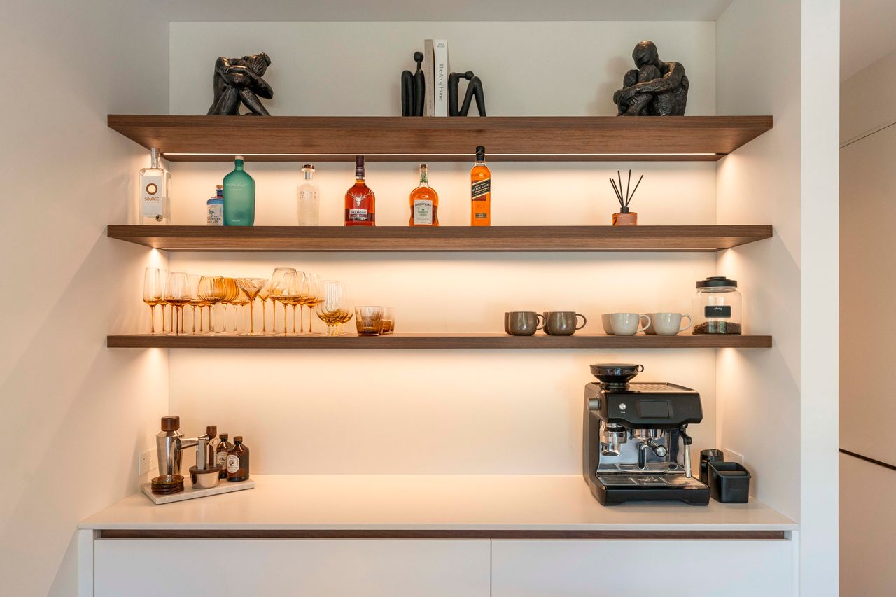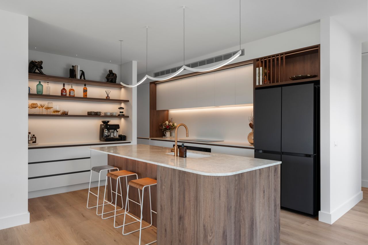 At the heart of the home is a beautifully crafted kitchen, complete with a seated island, dedicated coffee and bar area, and a well appointed walk-in pantry. This central space flows seamlessly into the open plan living and dining zones.