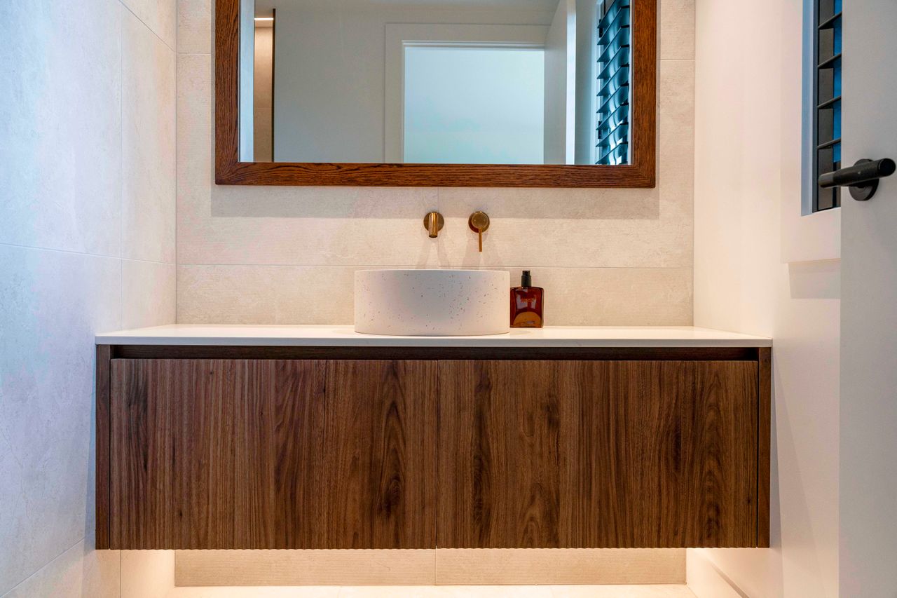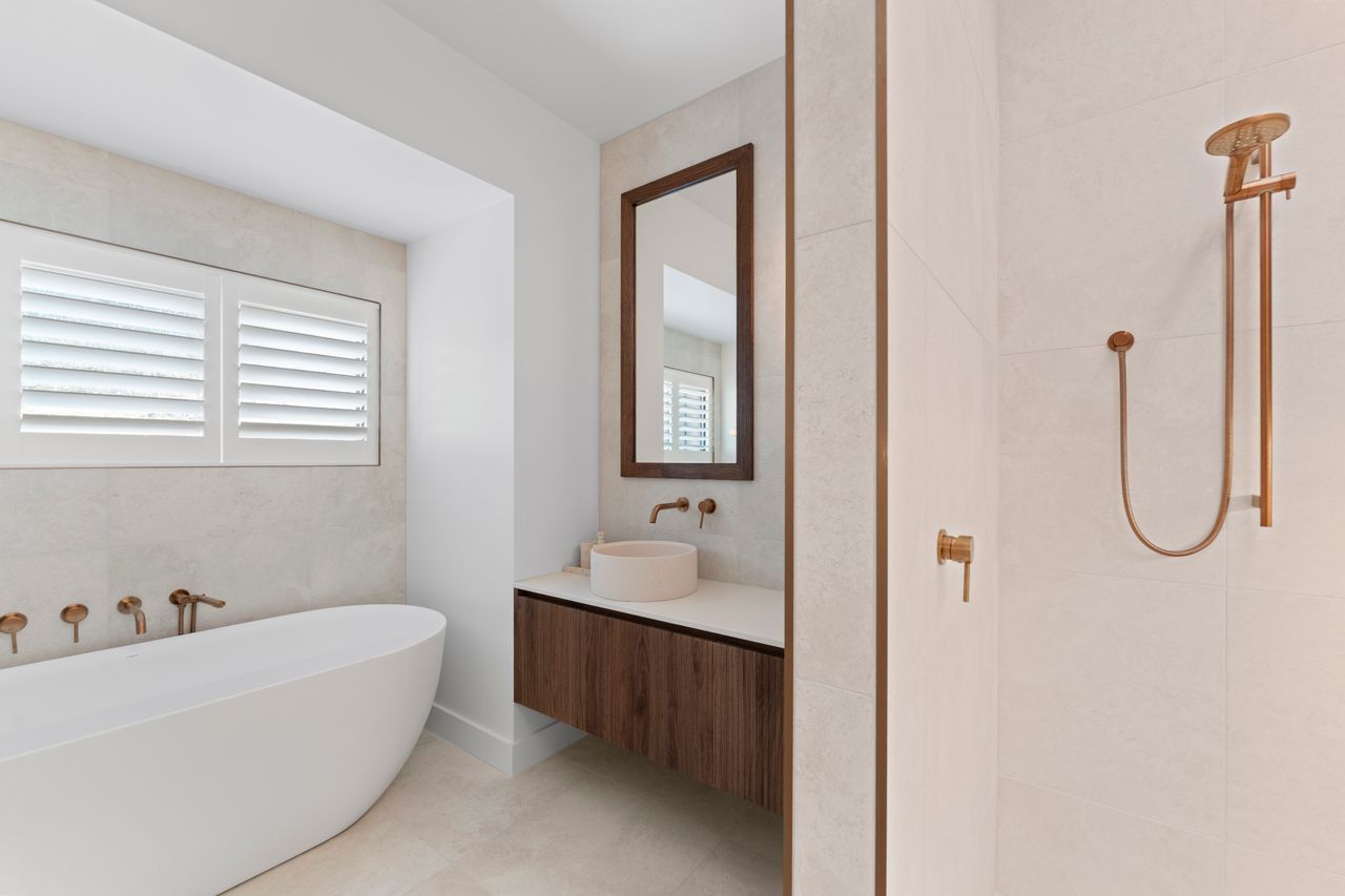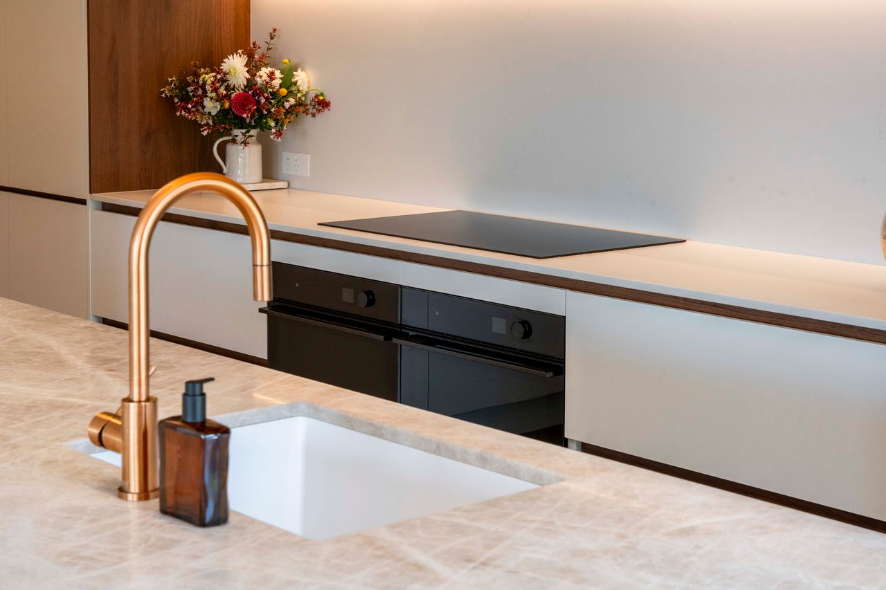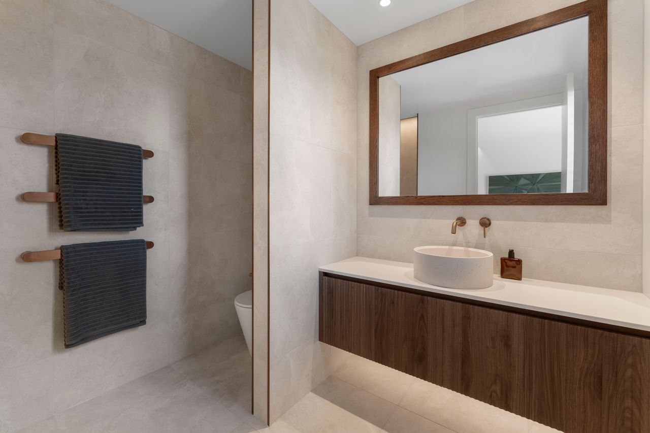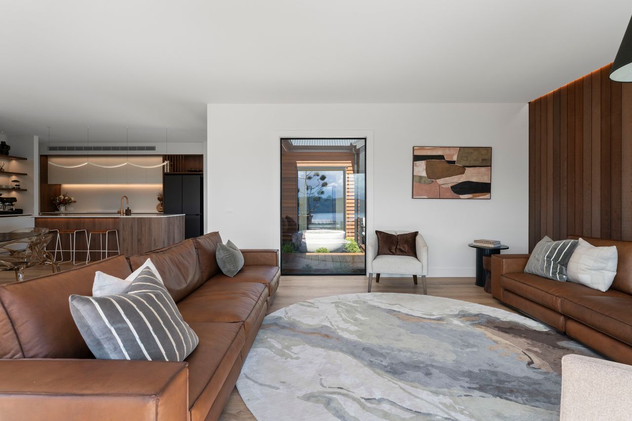 Warm walnut and creamy tones create a harmonious, inviting atmosphere. Taj Mahal stone benchtops, bespoke cabinetry, and high-end finishes elevate the interior craftsmanship, while ample glazing fills the home with natural light and connects living spaces to three expansive decks, framing the breathtaking lake views and serene native bush.